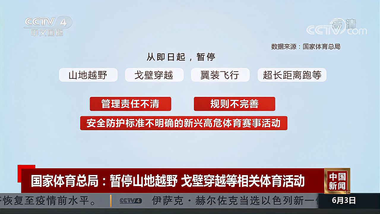 1天前 6月2日,国家体育总局官网发布关于暂停相关体育活动的通知。通知称,为切实保障人民群众身体健康和生命安全,从即日起,暂停山地越野、戈壁穿越、翼装飞行、超长距离跑等管理责任不清、规则不完...