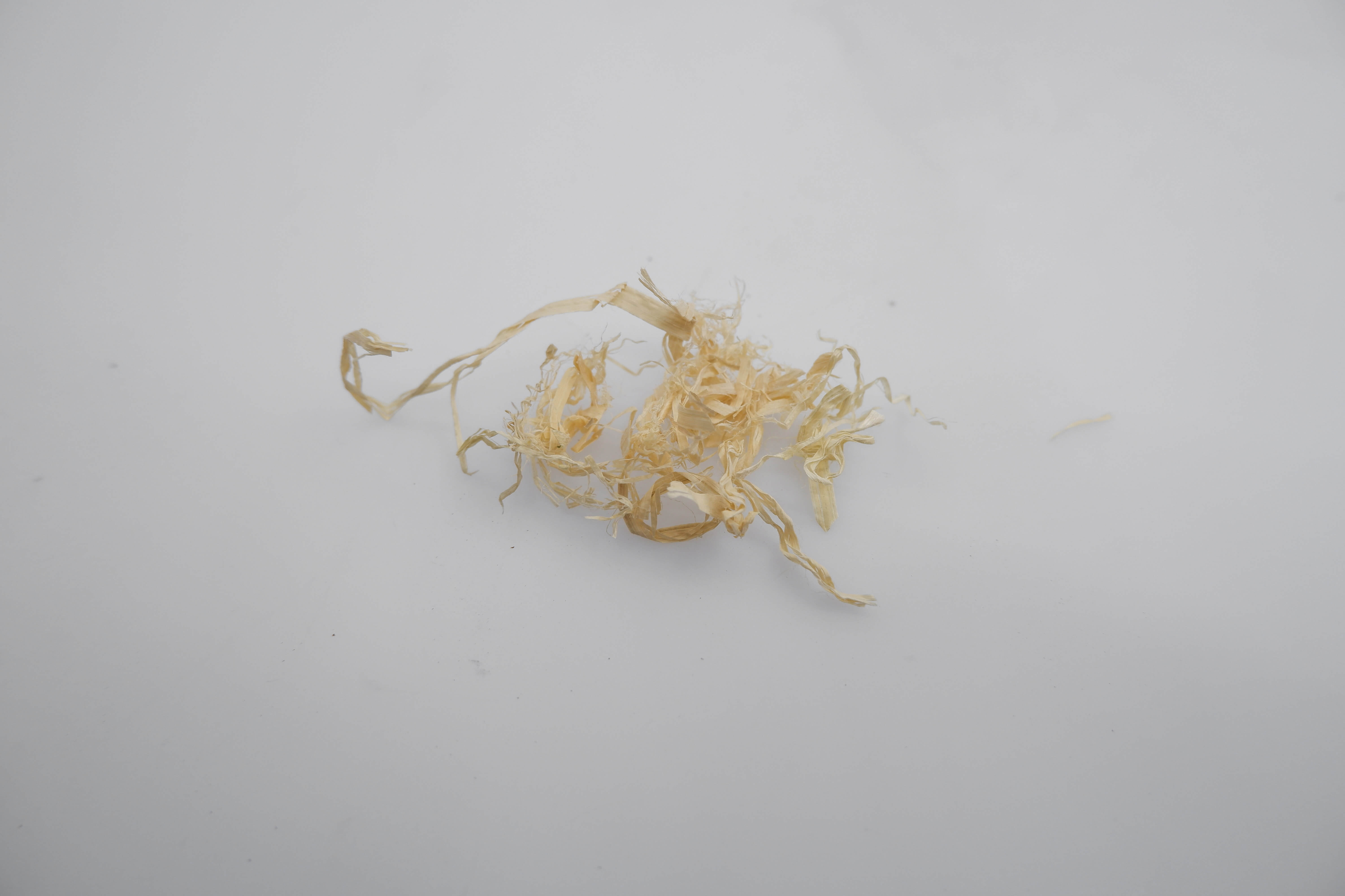 本品为卷曲成团的不规则丝条或呈长条形薄片状。宽窄厚薄不等,浅绿色、黄绿色或黄白色。纤维性,体轻松,质柔韧,有弹性。气微,味淡。