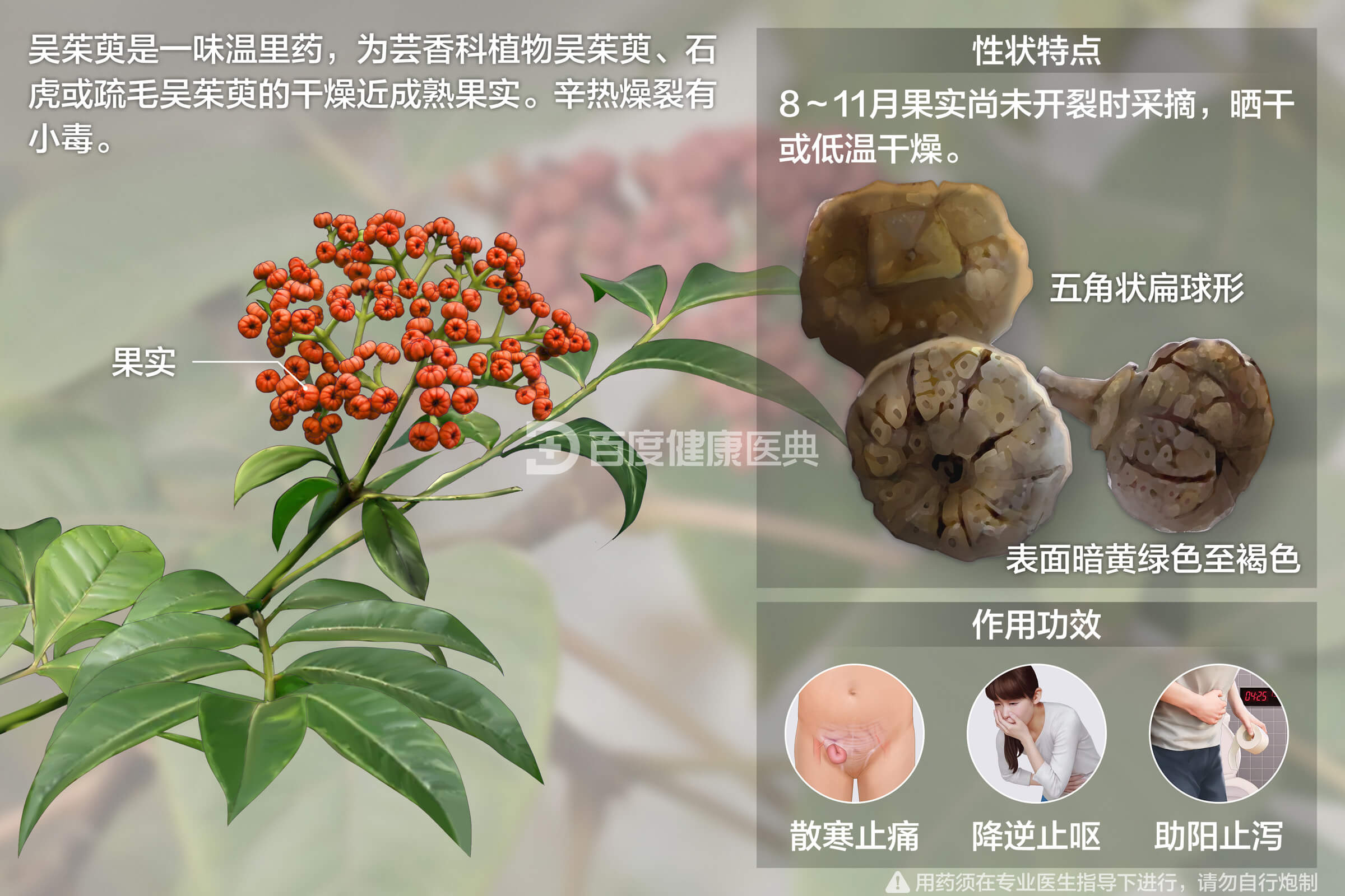 吴茱萸具有散寒止痛、降逆止呕、助阳止泻的功效。