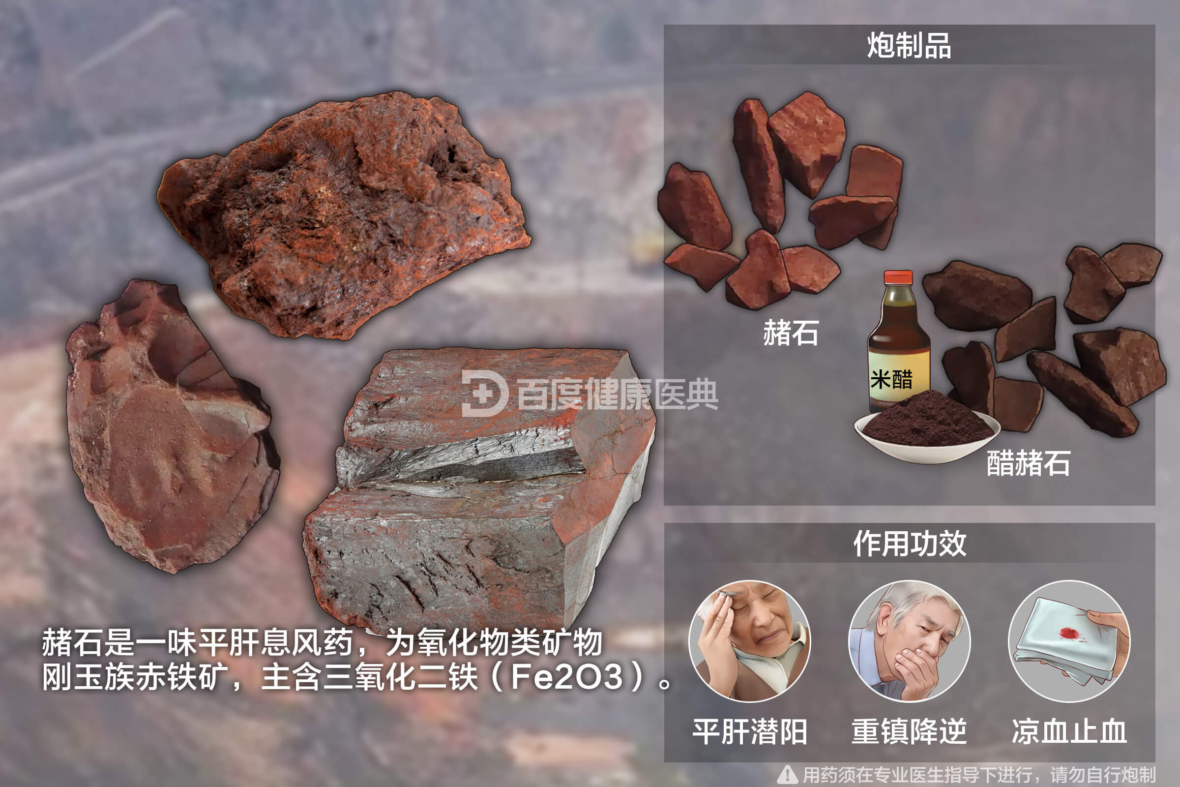 本品主要含三氧化二铁(Fe2O3)。并含镉、钴、铬、铜、锰、镁等多种微量元素。具有平肝潜阳,重镇降逆,凉血止血的功效。用于眩晕耳鸣,呕吐,噫气,呃逆,喘息,吐血,衄血,崩漏下血。