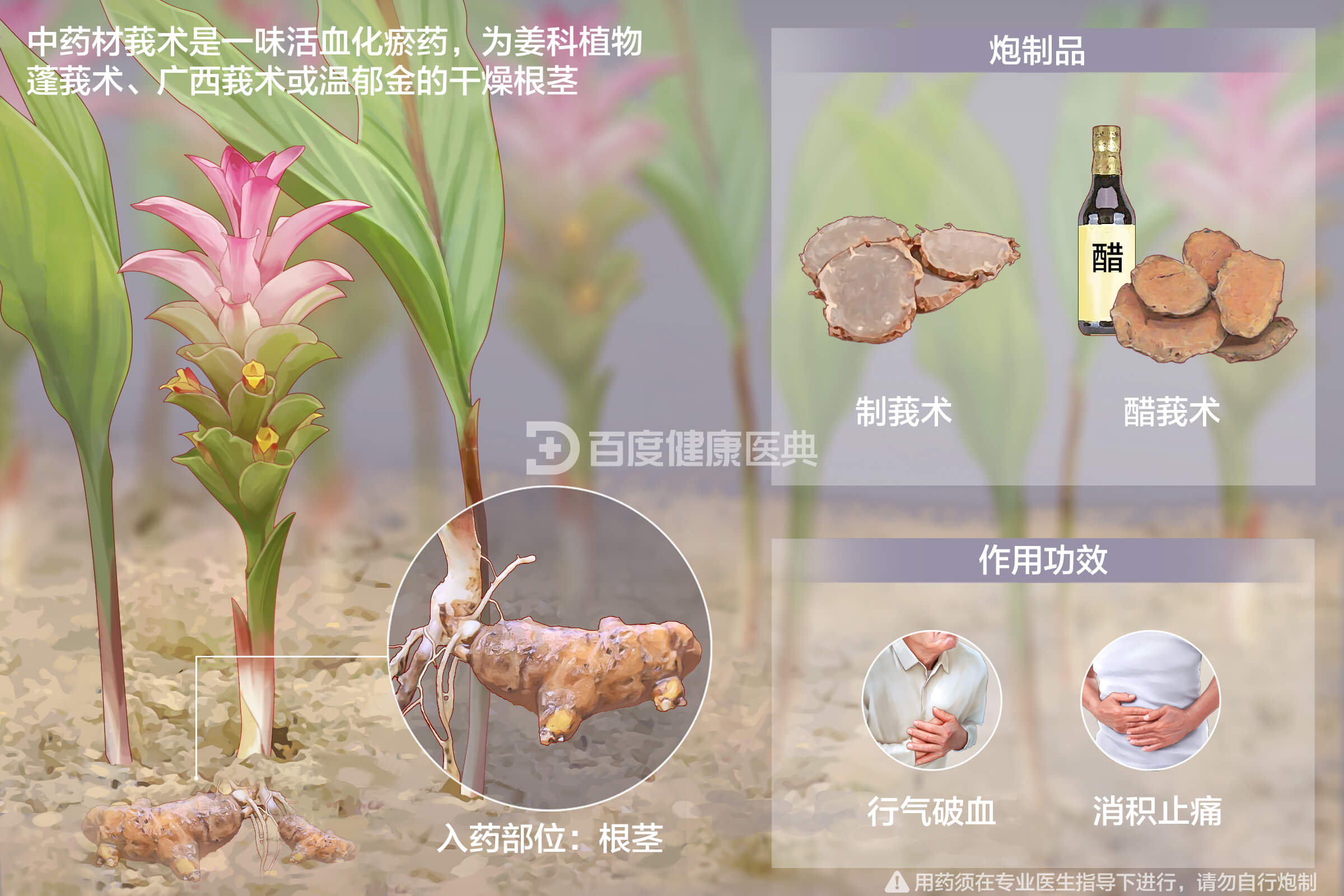 莪术性味辛、苦,温。归肝、脾经。具有行气破血,消积止痛的功效。