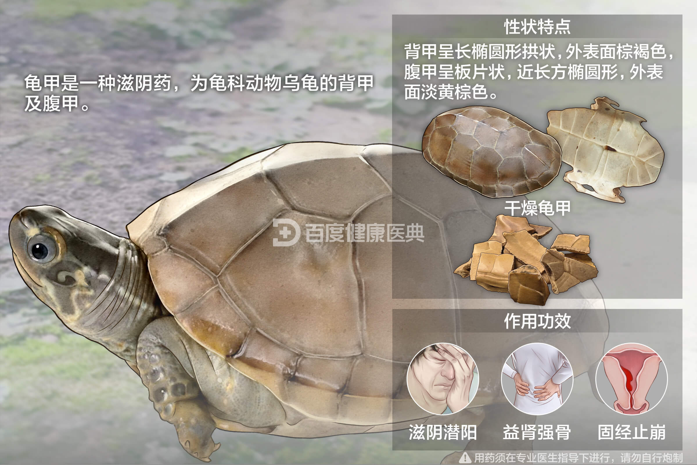 本品甘咸滋补,质重镇潜,寒能清泄,入肝、肾、心经。既滋肾阴、清虚热,又补肝肾、潜肝阳,善治阴虚阳亢、虚风内动、阴虚发热诸证,还益肾健骨、养血补心、凉血止血,治肾虚腰膝痿弱、筋骨不健,以及心悸失眠、血热崩漏等。