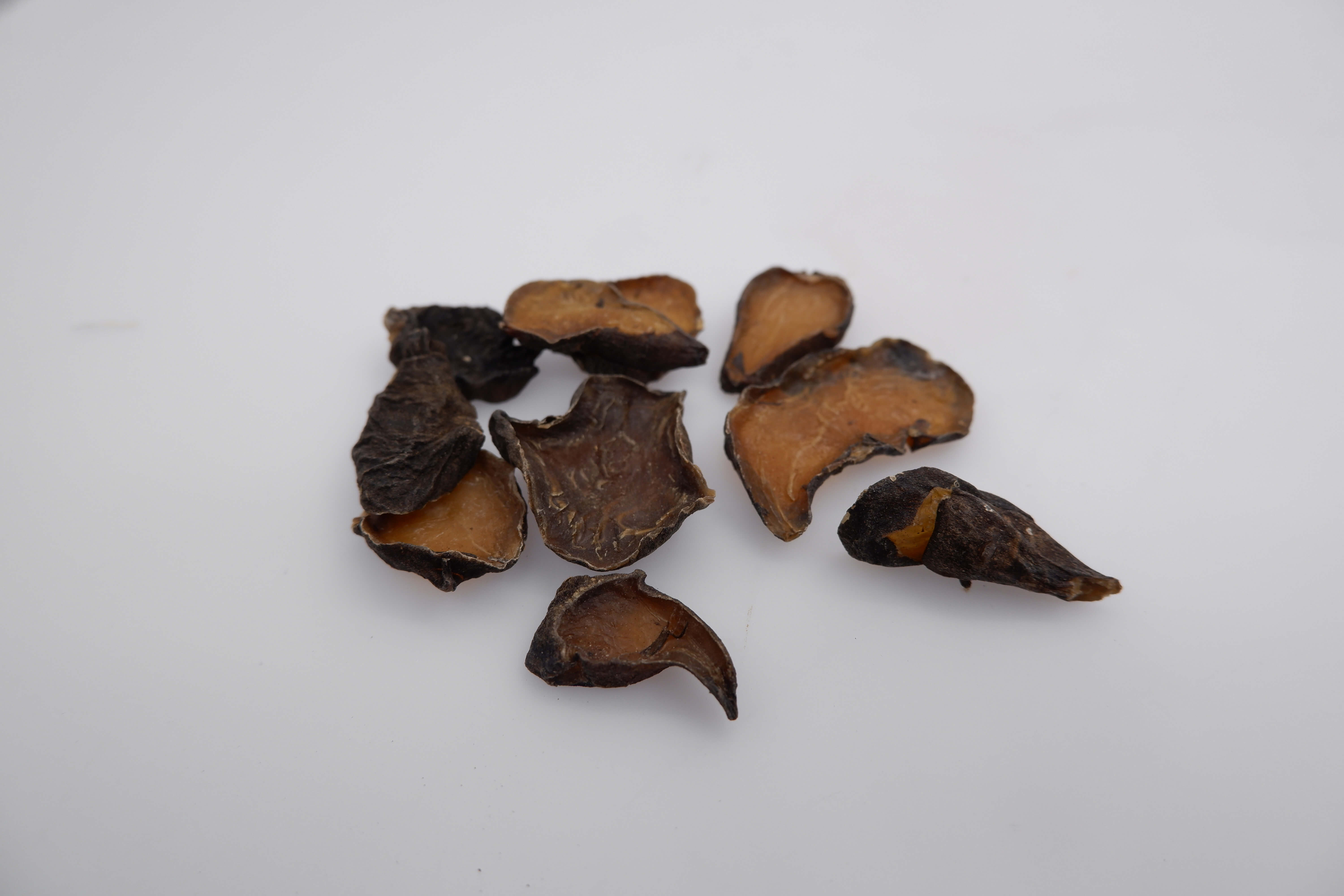气微,味咸而麻,刺舌。黑顺片为纵切片,上宽下窄,长1.7~5cm,宽0.9~3cm,厚0.2~0.5cm。外皮黑褐色,切面暗黄色,油润具光泽,半透明状,并有纵向导管束。质硬而脆,断面角质样。气微,味淡。白附片无外皮,黄白色,半透明,厚约0.3cm。